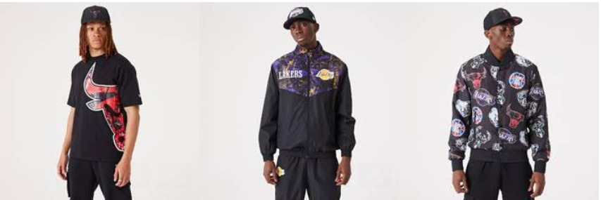 No que diz respeito ao vestuário, a “Coleção NBA New Era” oferece t-shirts, um casaco bomber e um fato de treino. Todos os itens possuem um fundo preto para realçar os salpicos de cor dos grafismos e logótipos ampliados. As t-shirts exibem logótipos enormes que se estendem da frente à lateral e até às costas. O fato de treino tem o logótipo dos Lakers no peito e no bolso direito das calças, com o mesmo efeito de salpicos de tinta. Para completar a coleção, a New Era apresenta um casaco bomber com uma selecção de logótipos de várias equipas da NBA, como Milwaukee Bucks e LA Clippers.