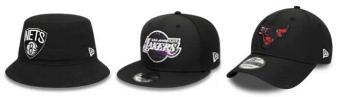 A “Coleção NBA New Era” engloba bucket hats e os icónicos bonés 9FIFTY e 9FORTY. Os logótipos das equipas são realçados nas respectivas silhuetas – Lakers nos 9FIFTY, Nets nos bucket hats e Chicago Bulls nos 9FORTY. Cada logótipo aparece numa versão ampliada com efeito de salpicos de tinta em cores contrastantes.