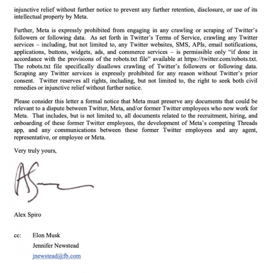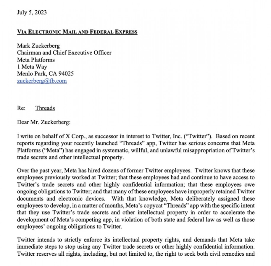 Segundo o Twitter, a Meta contratou dezenas de ex-funcionários do Twitter que tinham acesso a segredos comerciais e propriedade intelectual da empresa, que foram usados para desenvolver a Threads. O Twitter descreve a Threads como uma “cópia” da sua própria aplicação e exige que a Meta pare de usar os seus segredos comerciais e outras informações confidenciais, alegando que tais ações violam as leis estaduais e federais. A empresa também lembrou a Meta que não é permitido rastrear ou raspar os dados do Twitter.